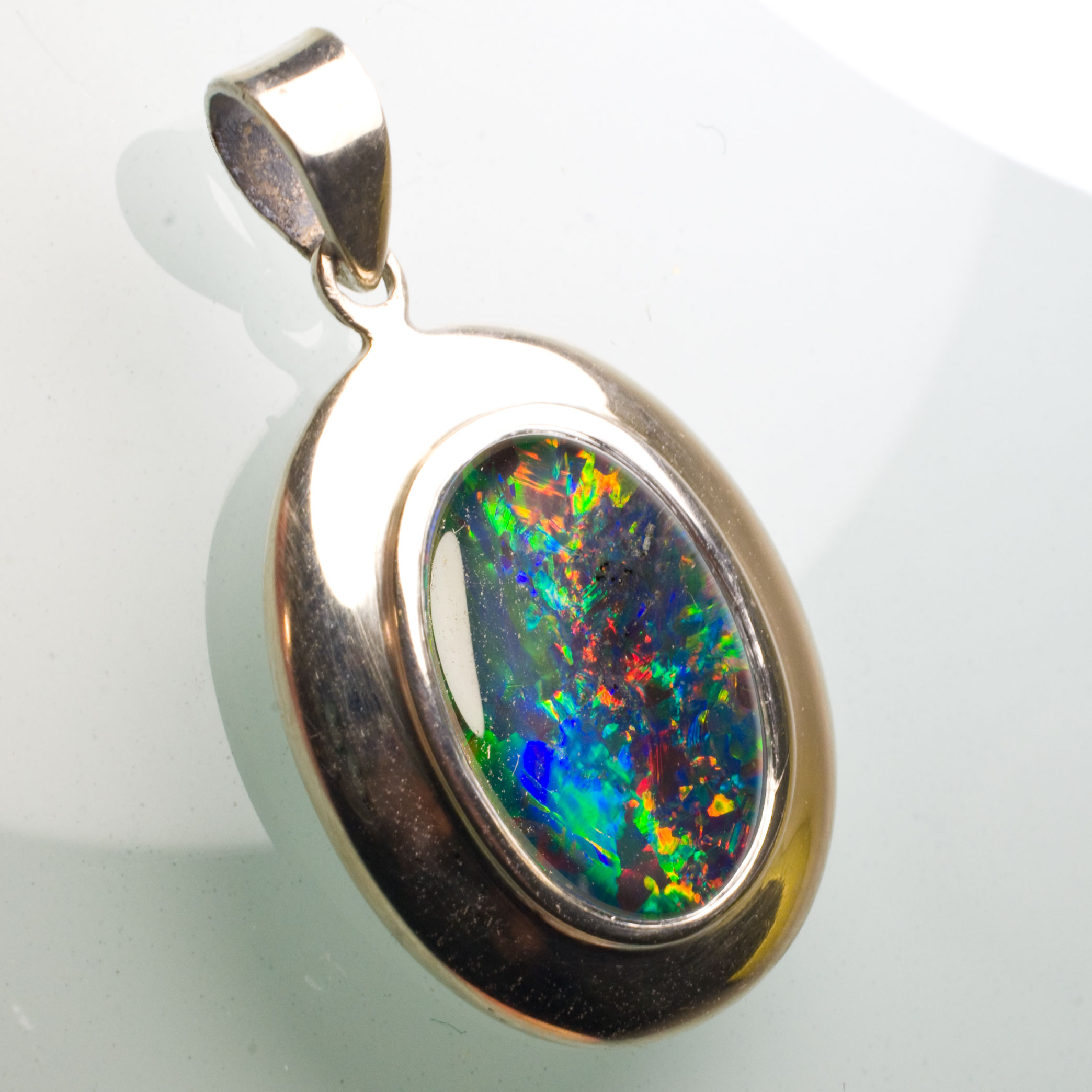 Pendentif argent triplet d'opale AA+ 14 x 10 mm Pendentif en argent serti d'un triplet d'opale AA+ (TR45-3) multicolore avec des zones géométriques de couleur verte, orange, jaune et rouge bien délimitées sur fond bleu. Le triplet vient d'Australie, la monture a été fabriquée au Royaume-Uni et le sertissage a été fait par nos soins en France. Ajouter au panier
