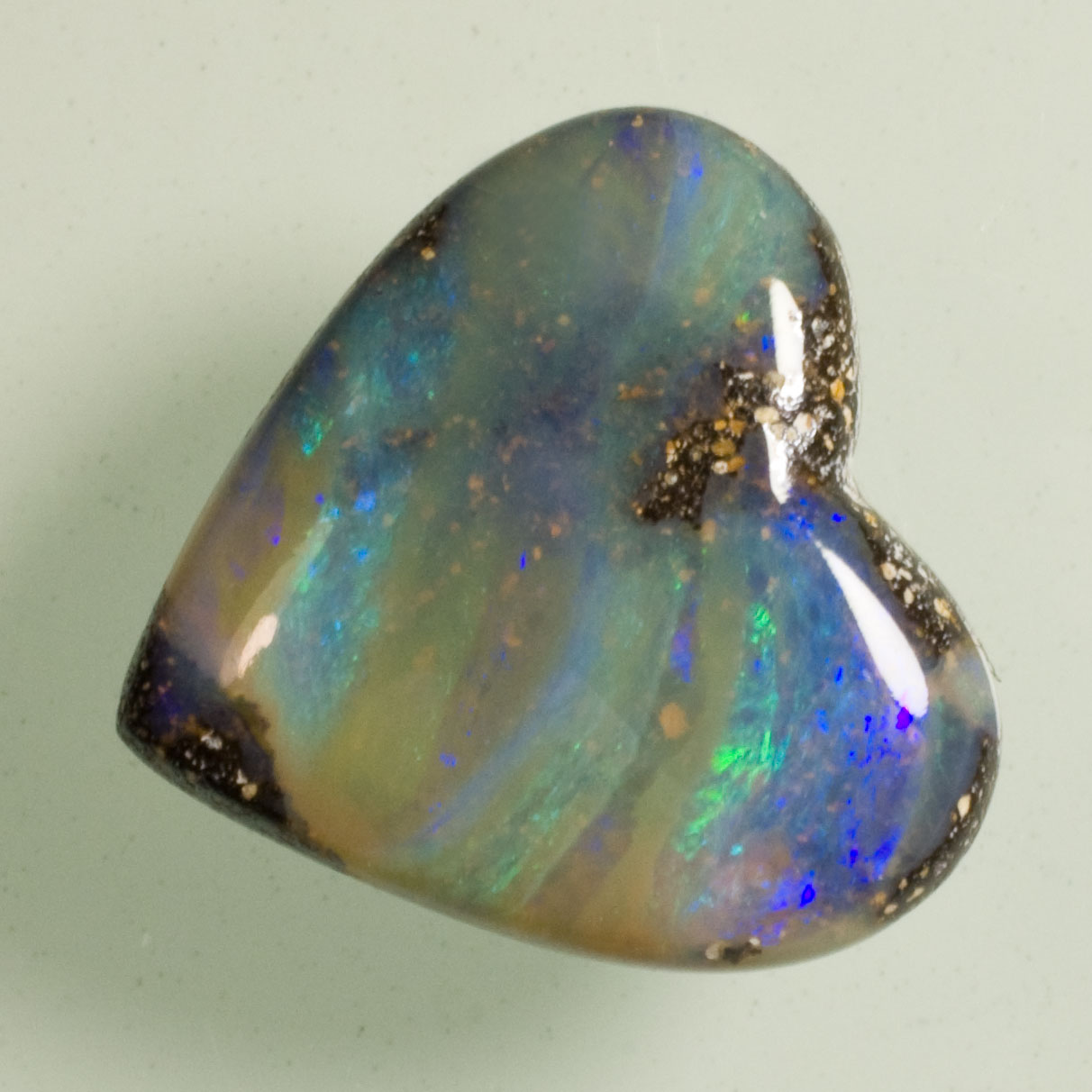 Opale bouder cœur 6.21 ct 14.25 x 13.6 mm Opale boulder en forme de coeur avec des bandes de couleurs bleues, vertes et beige. La pierre pèse 6.21 carats et mesure 14.25 x 13.6 mm. Ajouter au panier